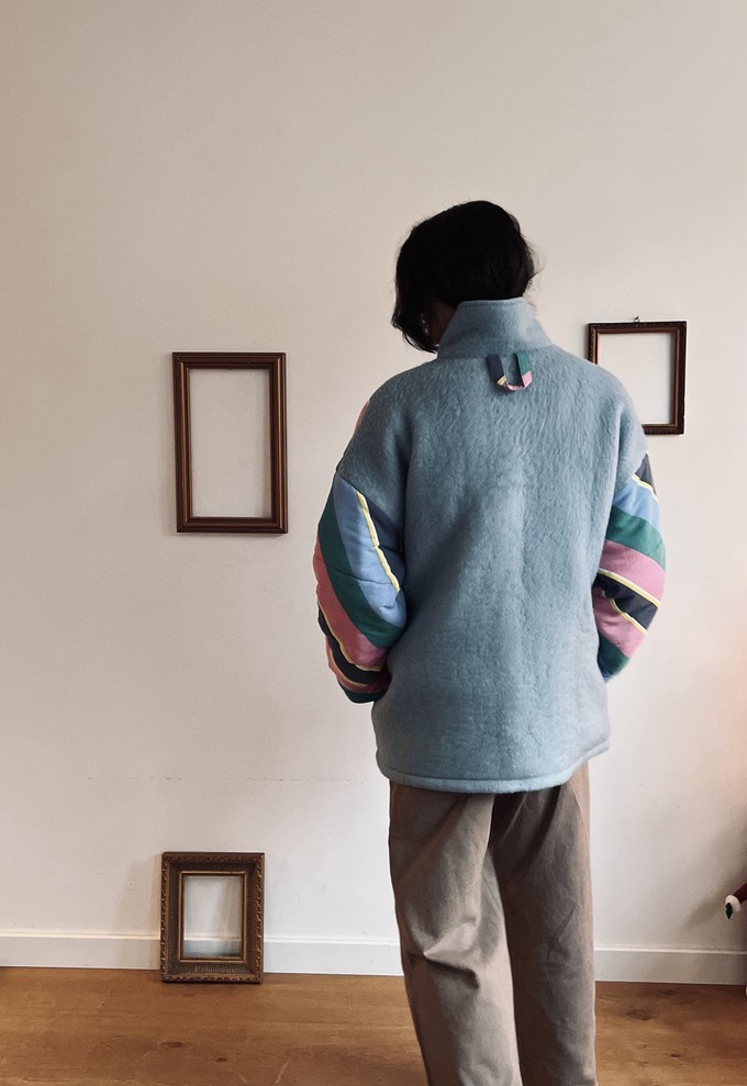 Ethically produced: The collections are designed and sewn in their own studio and one other workshop nearby. These studios are in Amsterdam, the Netherlands. The materials come from a Dutch webshop with woollen blankets and individual online sellers via, for example, Marktplaats and Noordgoed.