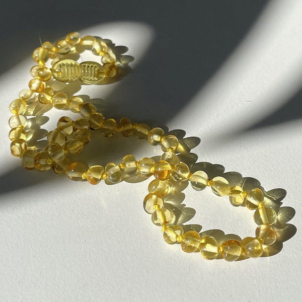 The baltic amber teething necklace is manufactured by a certified Lithuanian producing facility. For your child‘s safety, each bead is individually knotted so that not all beads come off at once. Supervision by moms and dads is recommended at all times when your little one is wearing or playing with the necklace.