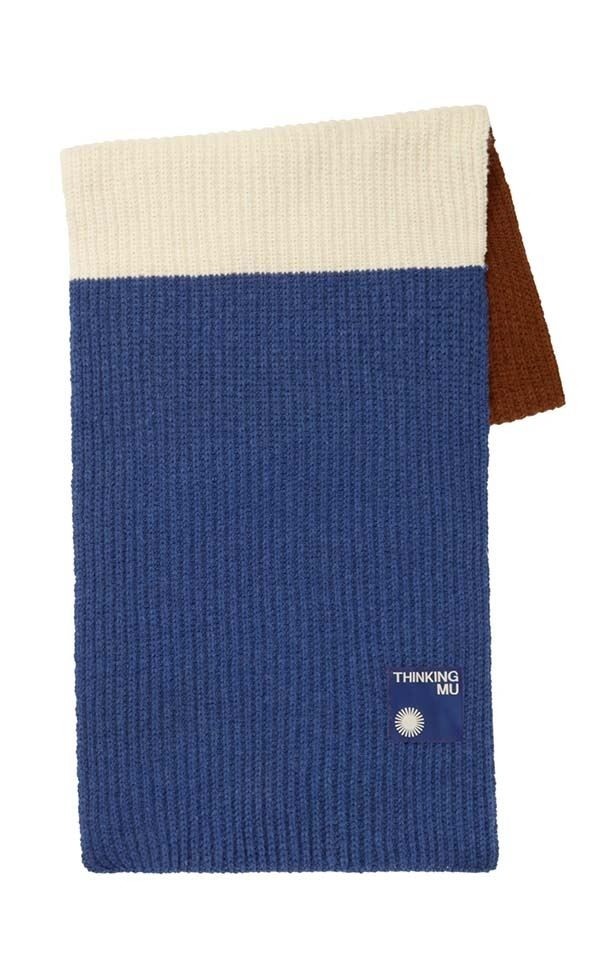 Extrafine wool multi-colour scarf with Thinking MU patch on front left.