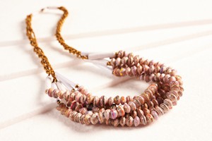 The necklace consists of several strands (usually 5) and is adorned with fine, round and elongated white pearls made from recycled paper. In addition, the chains are equipped with small artificial pearls, which vary in color from chain to chain.