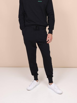 Men's black pants made from 95% organic cotton, 5% elastane.