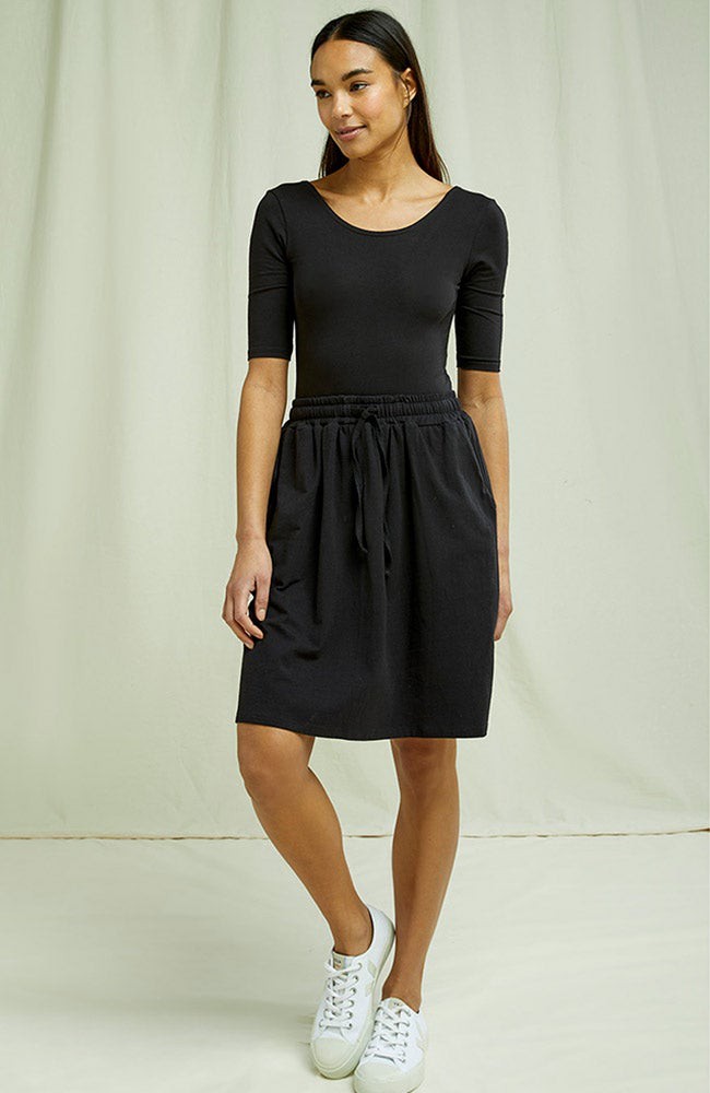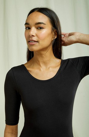 Comfortable black body from People Tree made of stretchy, soft organic cotton. The model has sleeves up to the elbows, a round neckline and a low back. Indispensable for a sophisticated & sustainable wardrobe!