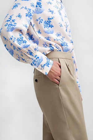 The Liv double pleated pants is designed to sit high on the waist. These full-length trousers are styled with tapered legs and creases at both front and back. The extra-wide hem makes it easy to turn them up. Features two welt pockets at the back, two slanted side pockets, and hook-and-bar closure. Can be combined with the Lois blazer to create a suit.