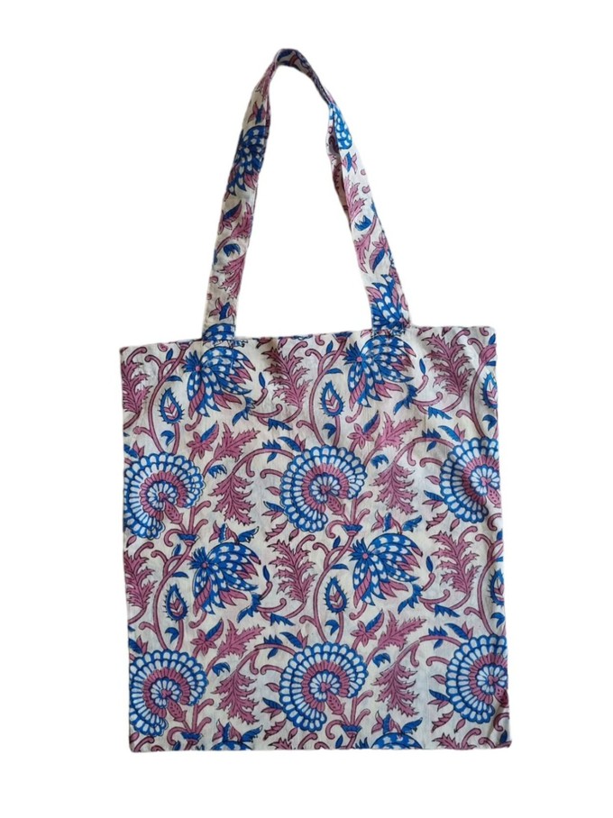 A beautiful hand printed organic cotton shopper tote bag that can be used for all your shopping needs. This design features a pretty blue and pink floral print that has been printed by artisans in India. This bag has been made from our excess fabric, which helps reduce our waste.