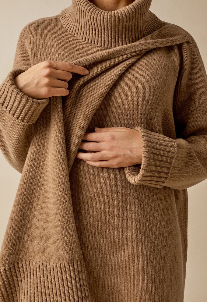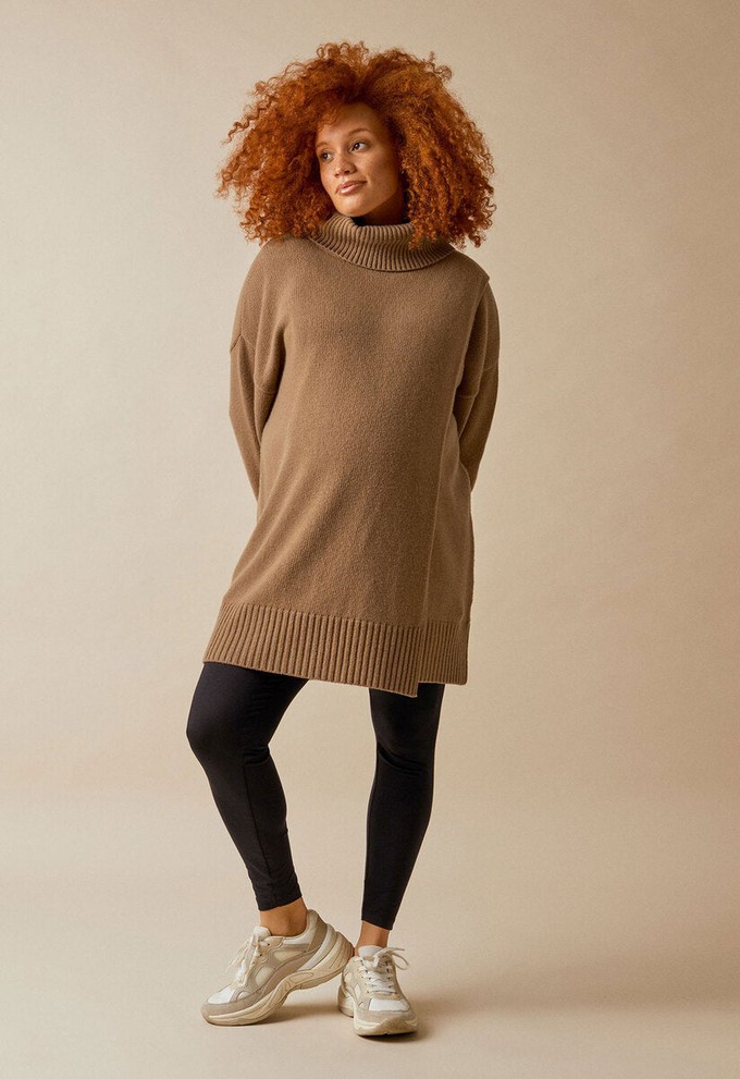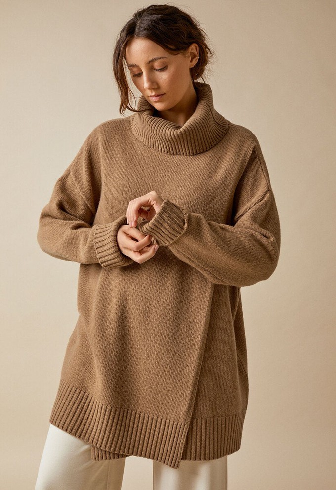 A long, knitted wool sweater made of a soft merino wool blend. Designed with an overlapping front panel that drapes nicely over growing pregnant bellies and opens up for breastfeeding in seconds. A big, chunky cowl neck, long cuffs and subtle ribbed details make it a sweater you'll love forever.