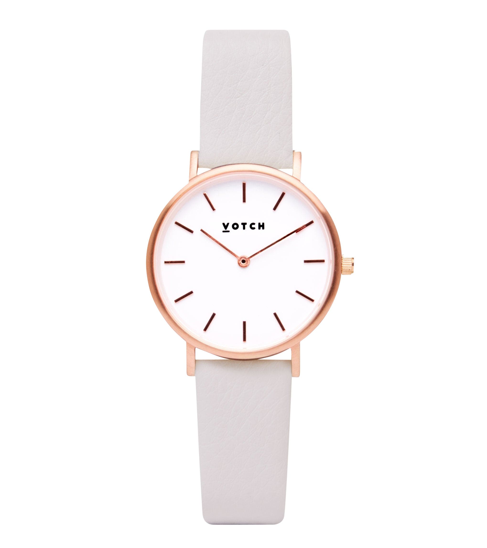 Our launch collection combines classic style and design across every timepiece. Each watch has a 33mm case and an eco friendly vegan leather strap. This watch comes in a Rose Gold case with light grey strap.
