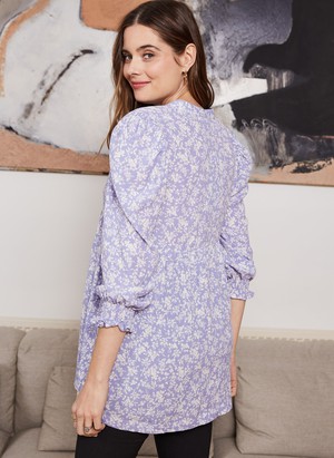 Floaty, feminine and floral - this blouse will make your outfit sing! All you need to elevate your maternity jeans and leggings, its buttons fasten down to an empire line seam where the fabric skims the bump for a flattering, longline silhouette. Topped with pretty smocked cuffs and a stand collar, it’s one of our new favourites.