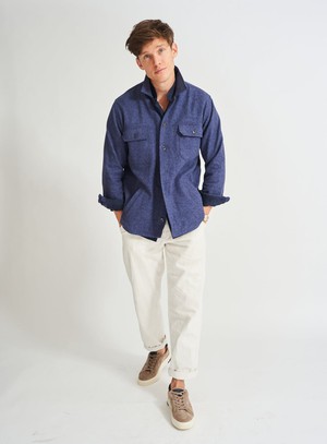 Our contemporary mens overshirt features a soft, comfortable collar that can be worn stand up and down and a stylish double-pocket design, with side welted pockets on the side body. This overshirt is made from a blend of 60% recycled cotton and 40% organic cotton woven in Italy, making it a sustainable choice for your wardrobe. It's perfect for layering as during the cooler autumn and winter months or as a jacket during spring and summer. A versatile addition to any capsule wardrobe.