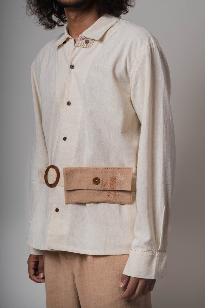 This Envelope bag with a wooden button offers adequate room to accommodate your essentials. It is a hand embroidered accessory that features stitches of Kantha embroidery and comes with two back loops for you to pair it with a belt.
