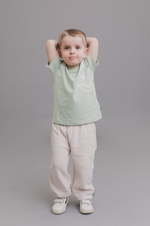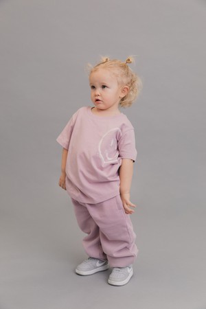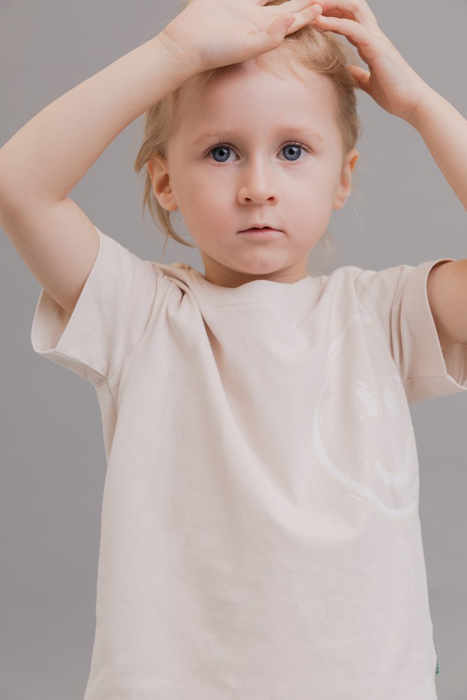 KIDS T-SHIRT WILLI is composed of 100% organic cotton. It is crafted from a smooth and compact long staple cotton with the weight of 180 GSM. This kids T-shirt comes with a regular fit, a round neck and short sleeves. The smiley print at the front side is water-based and is made of an ultrasoft fabric. WILLI can either be worn as a standalone piece or as a set when paired with our matching track pants and sweatshirt. The backside is accented by printed coordinates pointing to Dhaka, Bangladesh, the home of our production site and origin of most of our designs. As all our styles, WILLI sports a woven, sage green SURU STUDIOS label, which is distinctive of our brand.