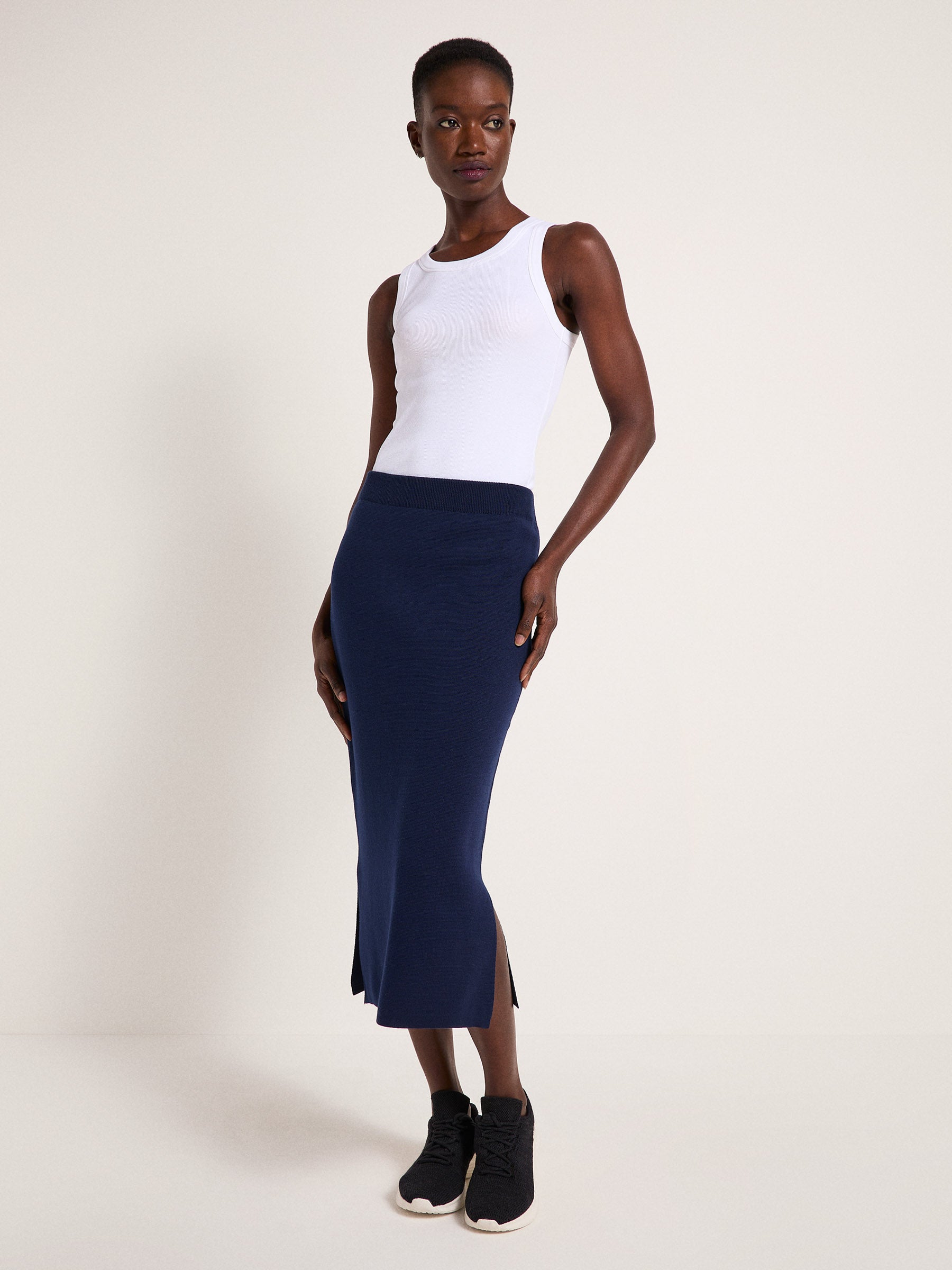 Basic must-have for the winter wardrobe: the midi skirt made of organic new wool and organic cotton knitted in Punto Milano. The subtle knitting gives the skirt a soft yet compact strength, making it easy to care for, durable and less susceptible to pilling. The elastic waistband, the 20 cm high slits on the sides and the soft knit make the skirt a real feel-good piece. The two patch pockets on the back also make the knitted skirt fashionable and casual. Tone-on-tone with a matching sweater and boots or casual with a T-shirt, blazer and boots - the skirt can be styled in many different ways.