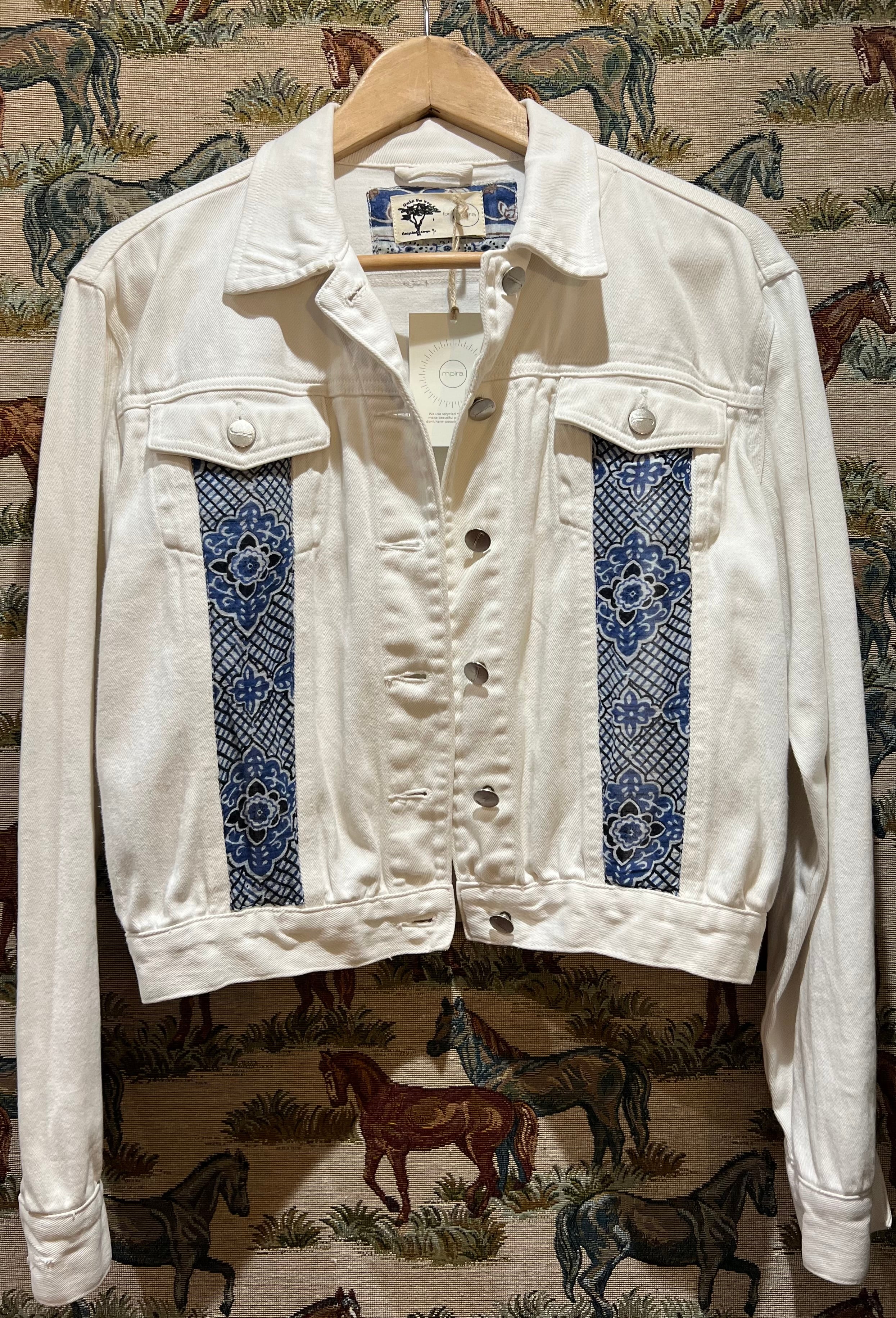 Preloved Denim Jacket laundered, repaired, decorated by hand with re used textiles and trims. Each piece is unique.