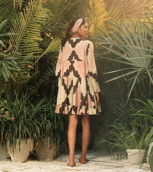 Stunning Shibori hand-dyed multi colored short dress with long cuffed sleeves and a frilled hem.