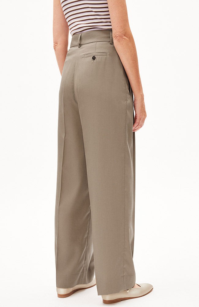 Hip, high waist pants with band pleats in a soft brown color from ARMEDANGELS. The model has a relaxed fit, has side pockets and multiple pleats on the front. The model falls a little wider than normal with an inseam of 78.5 cm. The model in the picture is 1.77m tall and is wearing size S.