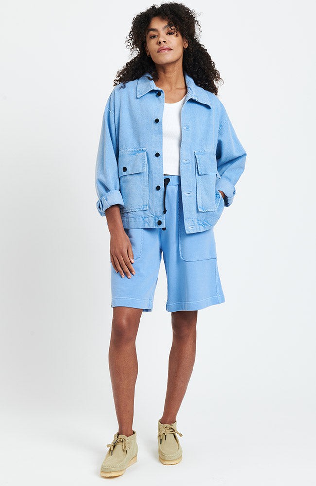 Cool jacket from our brand new Dutch brand New Optimist. The model is slightly cropped (short), has an oversized fit and a beautiful light blue color.