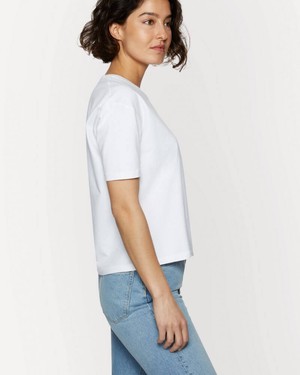 Angelina is what you’d call a wardrobe staple: the perfect sustainable white T-shirt you just don’t want to take off. In this case, it’s made of smooth cotton jersey and comes with dropped shoulders, longer sleeves than your average tee, a wider round neck, and a slightly boxy fit.