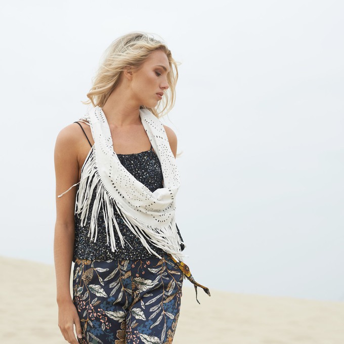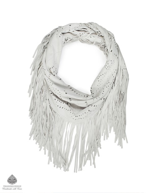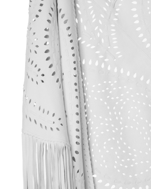 Bring an authentic boho luxe vibe to your wardrobe with this premium genuine suede shawl in bright white. Boasting an intricate hand perforated design and flowy fringes, you’ll love itlightweight and effortless feel. Wear it open in the front, knotted or toss one end over your shoulder, or around your hips like a pareo on the beach.