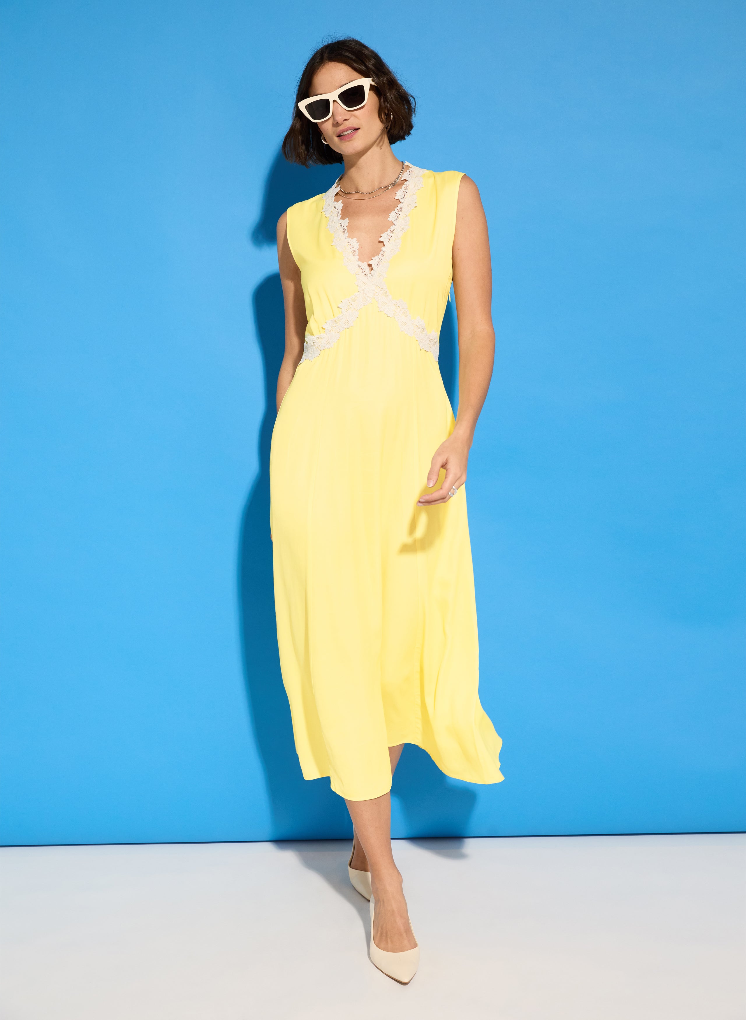 Look and feel instantly occasion-ready with the lingerie-inspired Marcella Midi Dress. This chic slip in soft yellow is cut with a v-shaped seam under the bust for the most flattering fit, and finished with a pretty lace trim. It skims the body before gently flaring out, and we’ve added a discreet panel of elastication to the back of the waist for maximum comfort. Made from silky viscose satin, it’s one to swish the night away in!