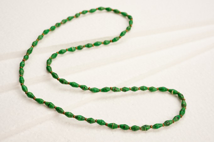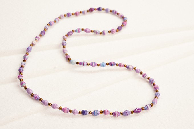 Because our paper pearl necklace Acholi Malaika is adorned with particularly filigree and small pearls made from recycled paper and small artificial pearls. This means that it does not appear bulky, but lies discreetly on the cleavage. And if you also like arm jewelry, you can also use it as a multi-row bracelet - 2 in 1, so to speak.
