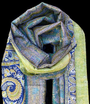 Kleurrijke tweezijdig draagbare sjaal van twee laagjes zijde, handmatig op elkaar geborduurd. De zijden stof is uitgeknipt van gedragen zijden sari's. Een sari is ongeveer 6,6m lang en wordt om het lichaam gedrapeerd. Miljoenen vrouwen in India dragen dagelijks een sari.
