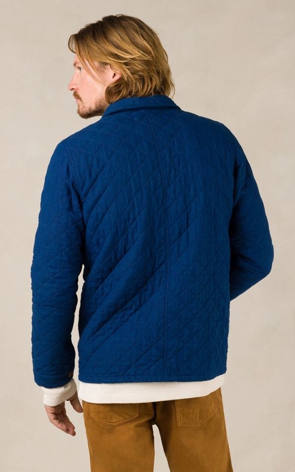 Short jacket with slim fit and long sleeves. The jacket has a flat collar and a button down placket. Two chest pockets, two front pockets and one inside of the jacket. Made with 100% pure, organic cotton. Made with fully biodegradable Corozo buttons which is known as vegetable ivory. The corozo material is scratch resistant, and very strong. The fabric is screen printed with azo-free dye to create a geometrical organic diamond pattern in an indigo shade.