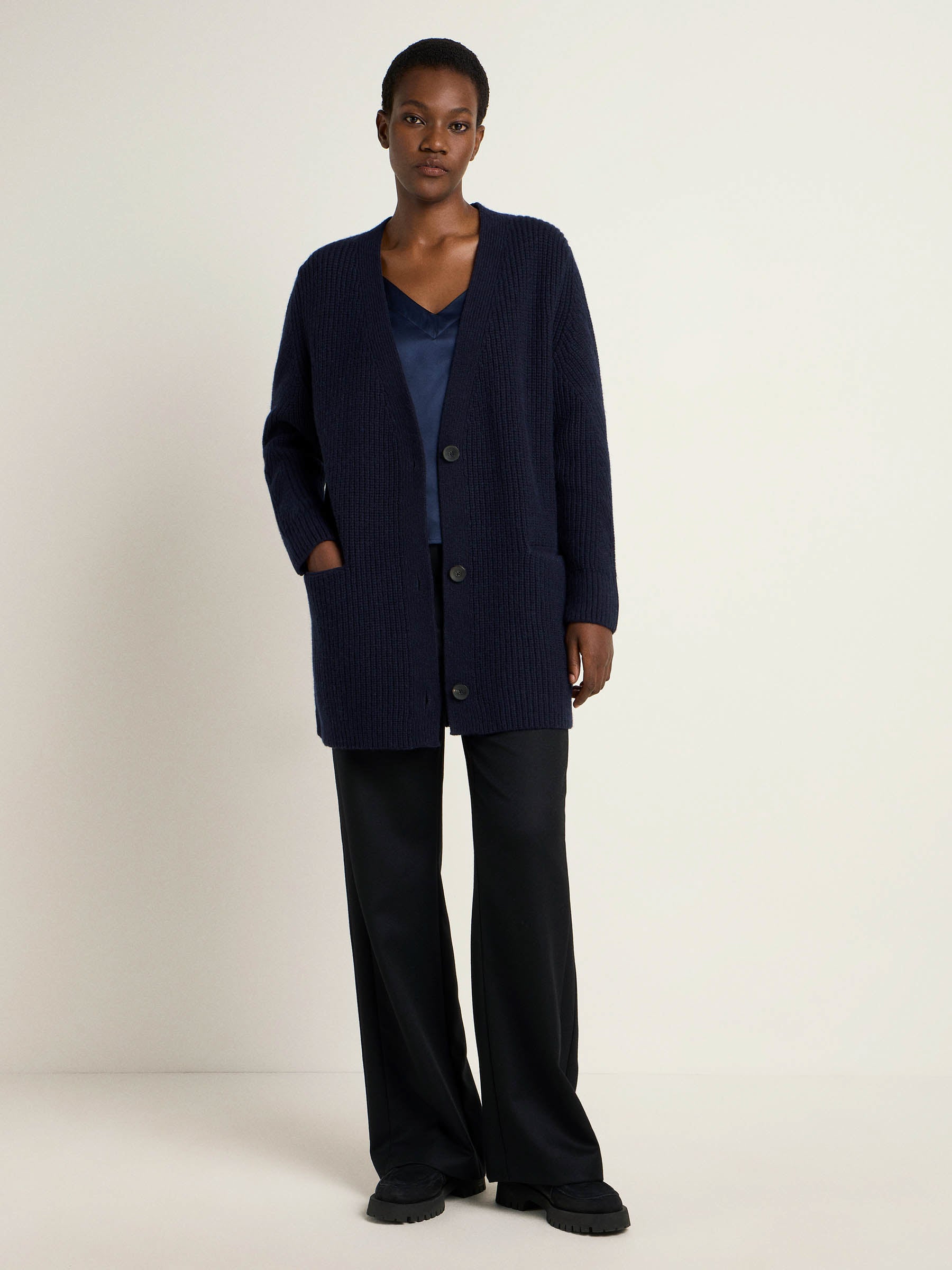 The combination of soft organic virgin wool and breathable organic cotton ensures pleasant warmth and a luxurious feel. The long, open silhouette and the fine knit details make this cardigan a versatile companion - whether over a dress, with jeans or as a layering piece on cool days.