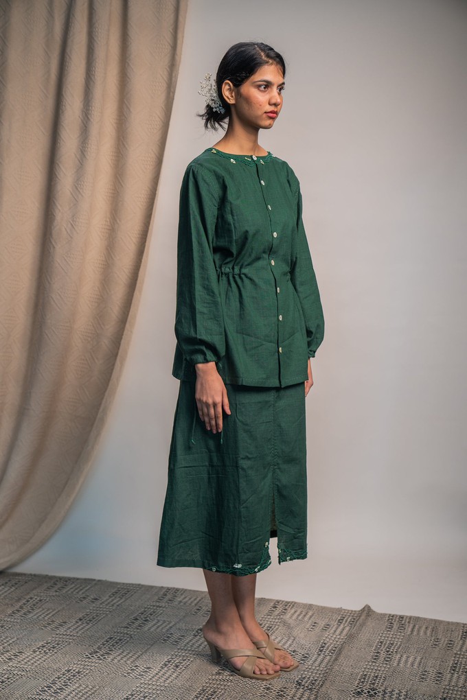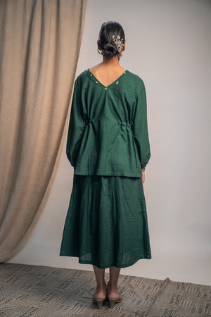 This Rewind Peplum Blouse comes in a rich and elegant colour of green that we call Secret Path. It has been dyed naturally with a mixture of Myrobalan and Indigo.