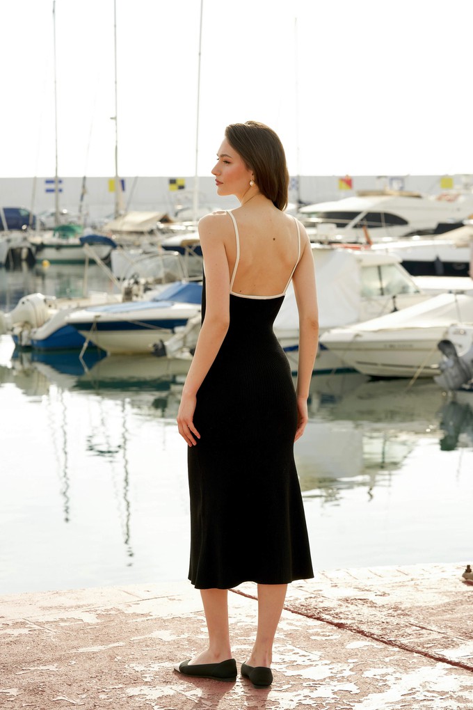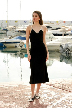 Crafted from sustainable Lenzing™ Ecovero with a luxurious stretch, this dress boasts a form-fitting minimalist silhouette, v-neckline, and woven piping for an elevated feel.