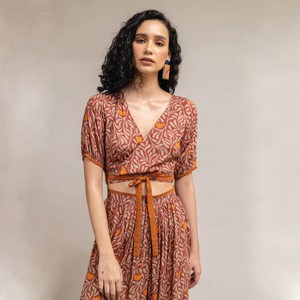 Printed wrap top with mustard color tie up