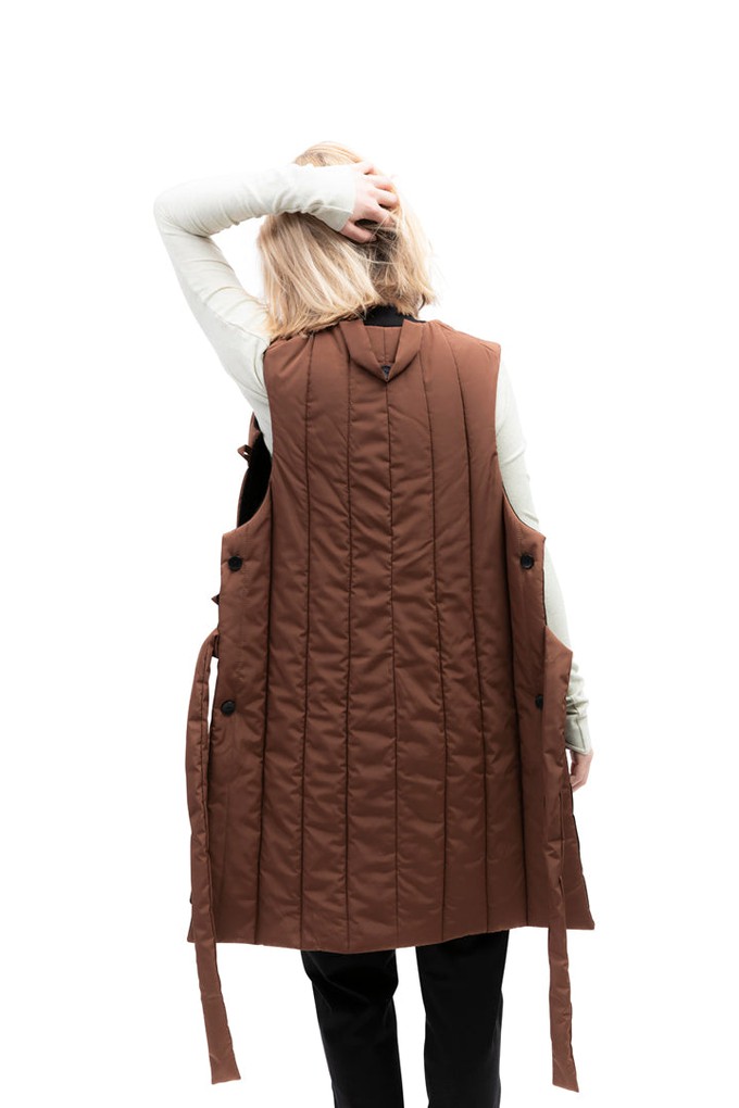 Get creative and combine this striking asymmetrical vest with your other Afka pieces. Design a different layered look every morning and stay warm and comfy all day long. The vest has a nylon outer layer and soft lining, open sides, and can be tied at the waist with a detachable belt. It comes with a pelerine you can wear around your shoulders together with the vest or separately.