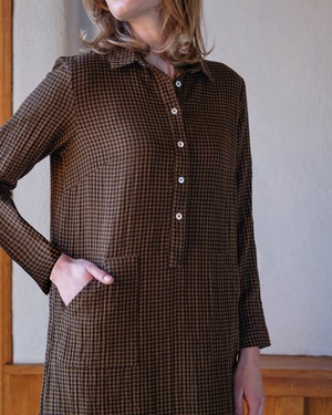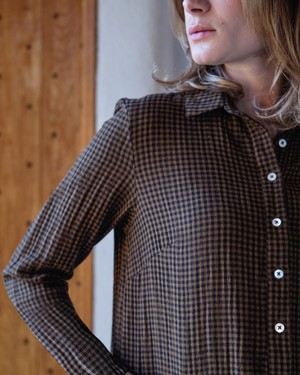 Straight cut shirt dress made in a soft double gauze cotton cloth with a two-tone small check. A new fabric for the season, it is cosy, durable, and drapes beautifully. This relaxed-fit shirt dress has an easy-to-wear shape and is finished with two large, patched pockets – a practical, timeless design in a new fabric for this season.