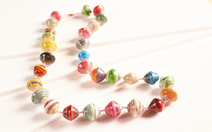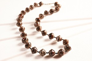This chain consists of very large, round beads made of recycled paper and is equipped with small artificial beads between the paper beads, which vary in color from chain to chain. And when we say big, we also mean big: The paper beads are approx. 2.5 cm x 2 cm long and wide! That means this chain is a real eye magnet.