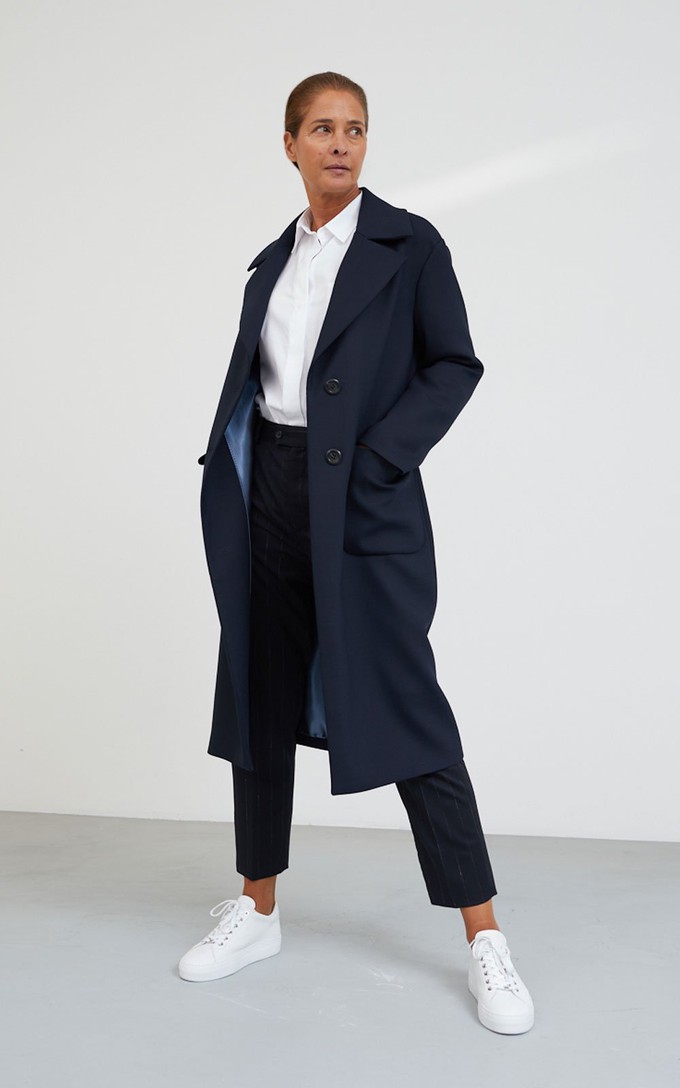 The classic New York coat is designed with an oversized fit and dropped shoulders. This coat with notch collar is an ageless and timeless choice. It has a straight silhouette with a two button closure. This longer coat has a mid-calf length and features two front patch pockets. Beautifull but fragile material. Be carefull with sharp items.