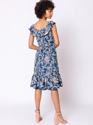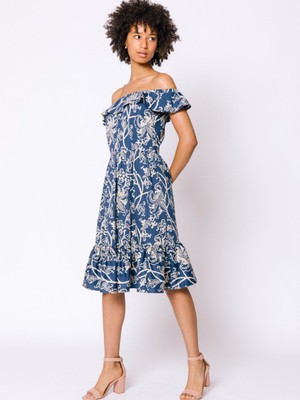 Our Fair Trade Transformation Dress is made from sustainable organic cotton that has been hand block printed by artisans in India, using eco-friendly dyes. The indigo and ivory floral design is timeless and versatile. The frilled neck detail on this dress can be worn either on or off the shoulder and the dress features a waist seam and a gathered tier at the hem.