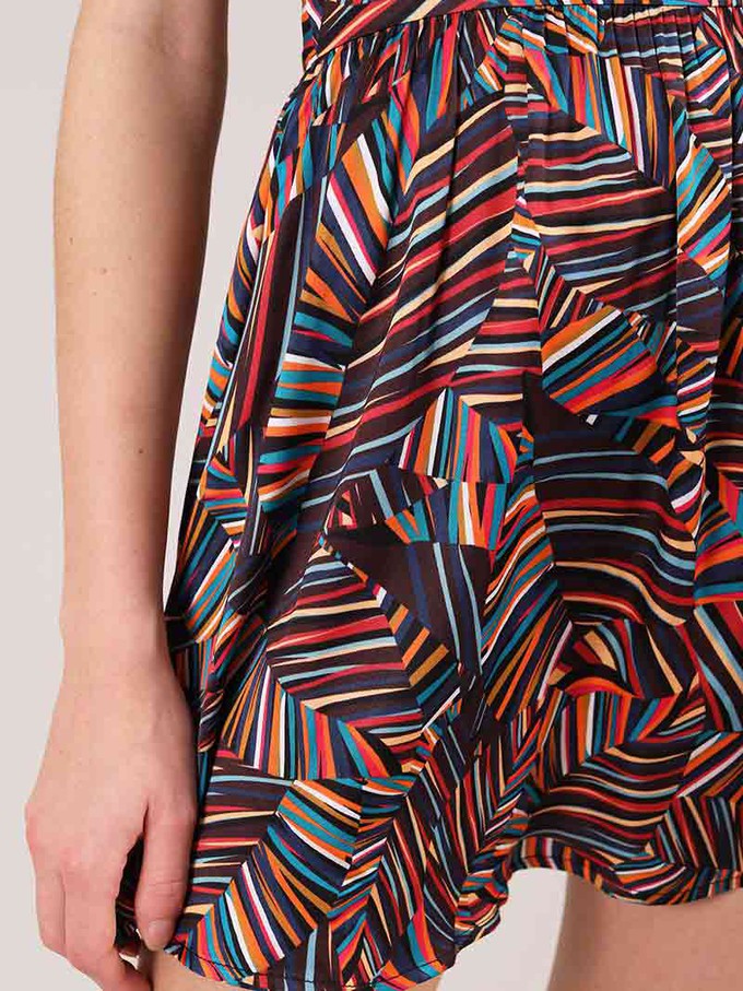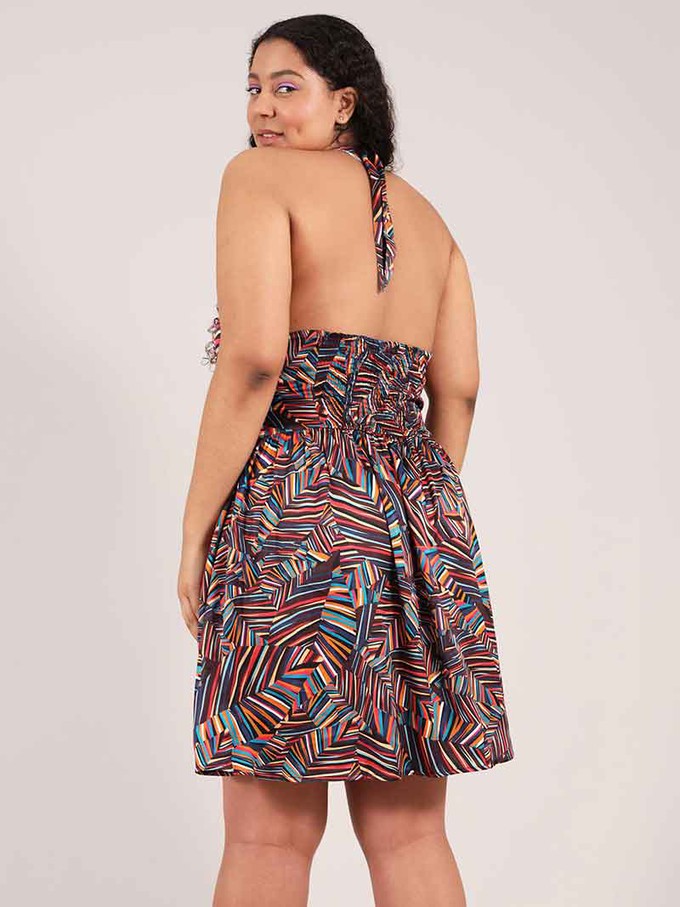 The Beachy Halter Neck Mini Dress has a sexy comfortable fit. It is fitted around the waist, with an elasticated back for extra flexibility. There is an invisible size zip so that it is easy to put it on and off. The dress has an airy circle skirt. It is true to size.