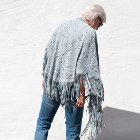 Crafted from velvet soft suede leather, the Lea shawl is fully embellished by hand with perforations, delicate leather embroideries and finished with long suede fringes. Style it effortlesslydraped over a maxi dress, or over jeans for a night out.