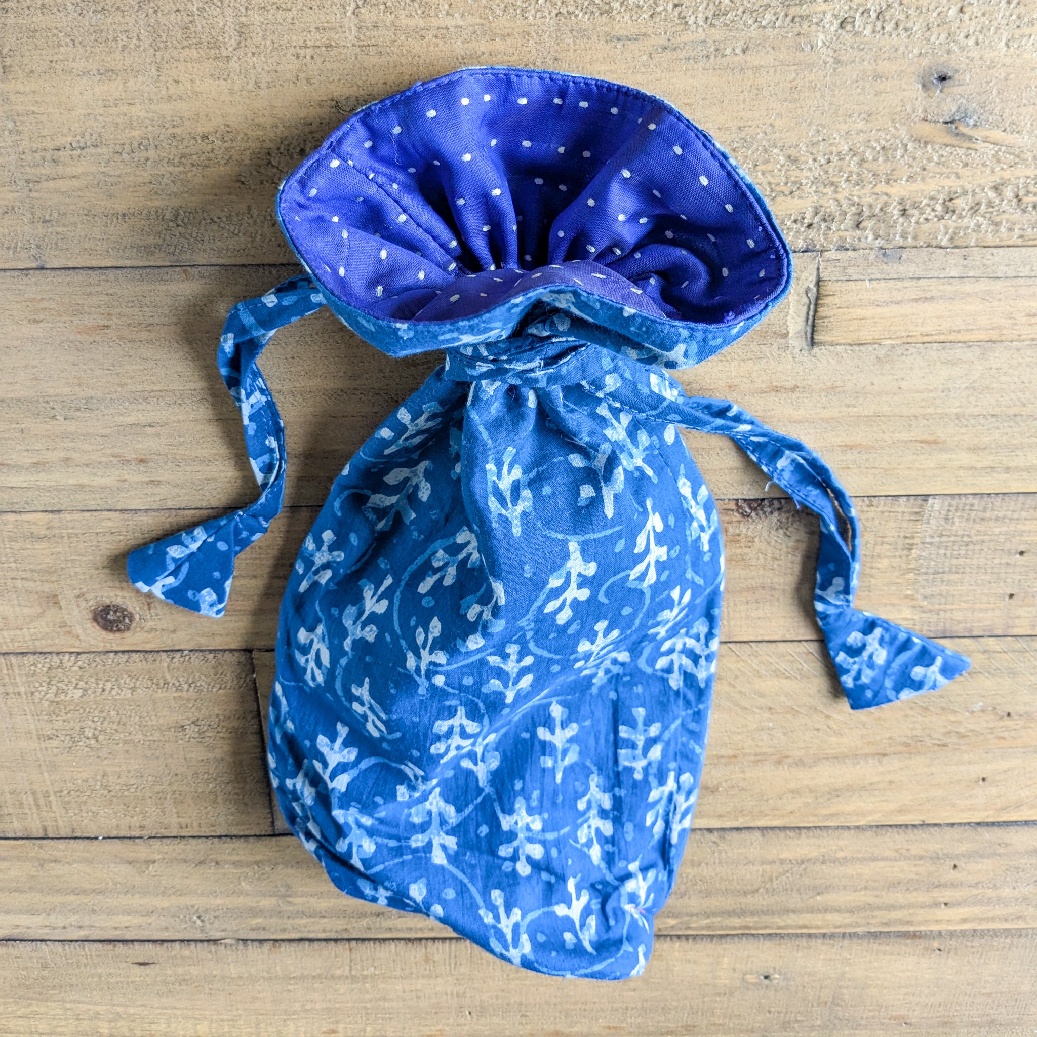 Meet our beautiful reusable Kalamkari cotton gift bags, with bright colours and various traditional Indian prints. Each of these bags were ethically handmade by empowered women artisans in India. Each bag is sturdy and strong, with thick upcycled sari lining to ensure that trinkets, gifts or anything else is stored securely.