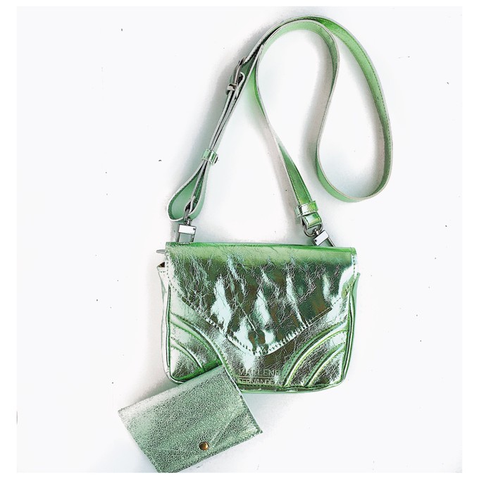 The Farahnash bag is made of metallic green leather with Yellow Thai silk inside.