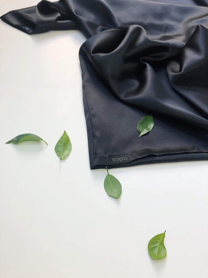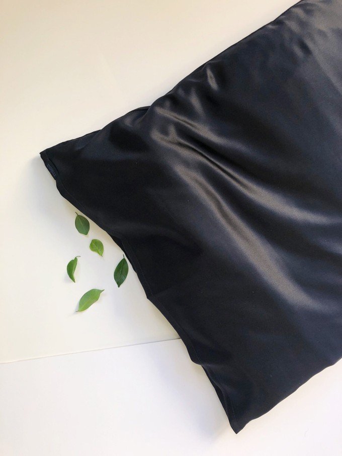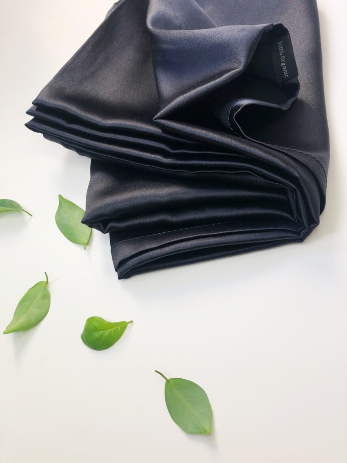 Wear organic, sleep organic. Our particularly heavy silk pillowcase in thick, midnight black glossy satin weave. Handcrafted from organically dyed, non-violent peace silk with a complementary washing bag.