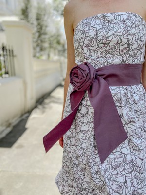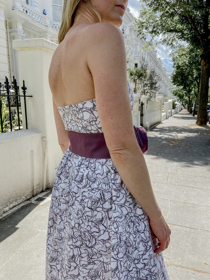 Our floral printed Hope Prom Dress is made from organic cotton that has been hand block printed by artisans in India, using eco-friendly dyes. The linear floral print is grey and mauve, and the dress features a contrast mauve removable waist sash and large corsage. Its strapless prom shape is a timeless silhouette, accentuating the waist. The fitted bodice is boned for extra support and the dress is fastened by a concealed side zip.