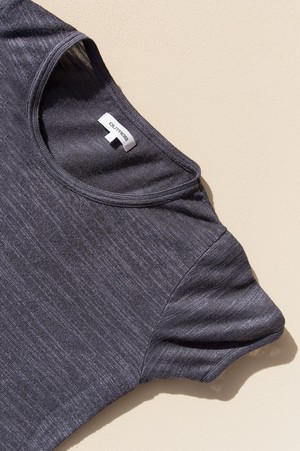 A tighter or slimmer fit T-shirt in a fine slub 2 yarn mixed fabric. Perfected with details, such as a flatlock stitched neckbinding and cuffbinding . We have finished the bottom-hem with a babylock stitching to make the difference. The viscose is an ultra soft yarn, a nice wear for the skin and we added recycled polyester to have the dimensions visible.