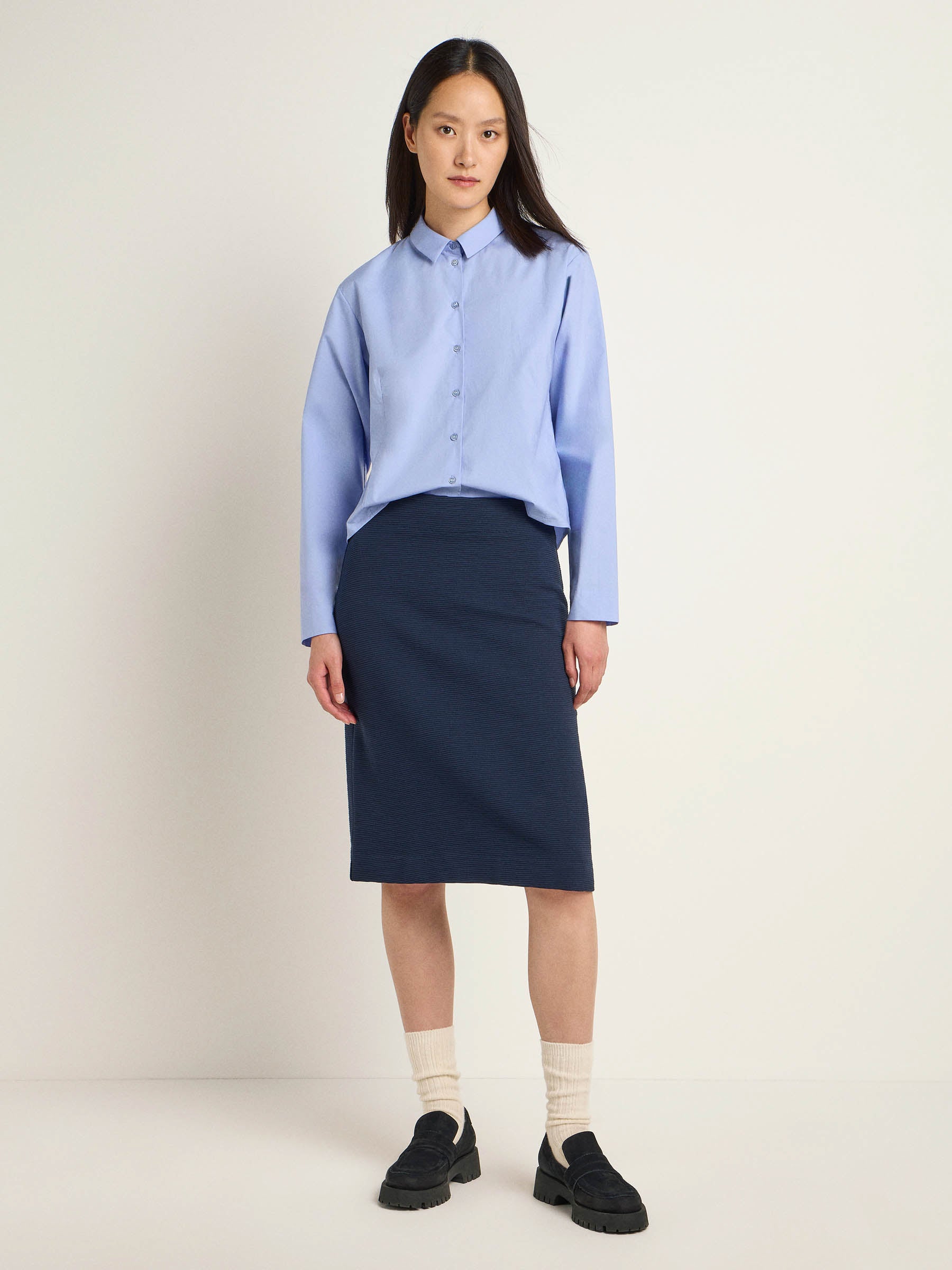 The pleasant structure made of organic cotton and recycled polyester ensures a casual, modern look and flatters your figure. The midi length and jersey fabric offer optimal comfort and make the skirt a perfect companion for cooler days. This skirt can be perfectly combined with our structured shirt made of organic cotton and recycled polyester.