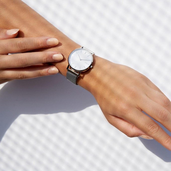 The Solios Solar Watch perfectly combines aesthetic, green technology, and durable materials. The 8mm thin silver-colored 316L stainless steel case is topped by a White dial with a minimalist style and offers a water-resistance of 3 ATM. The hardened mineral glass is covered with a robust sapphire crystal to limit scratches. At the heart, a solar cell allows the watch to recharge by itself and offers a 6-month energy reserve. In addition to promoting slow fashion with style, you'll never have to change your battery.