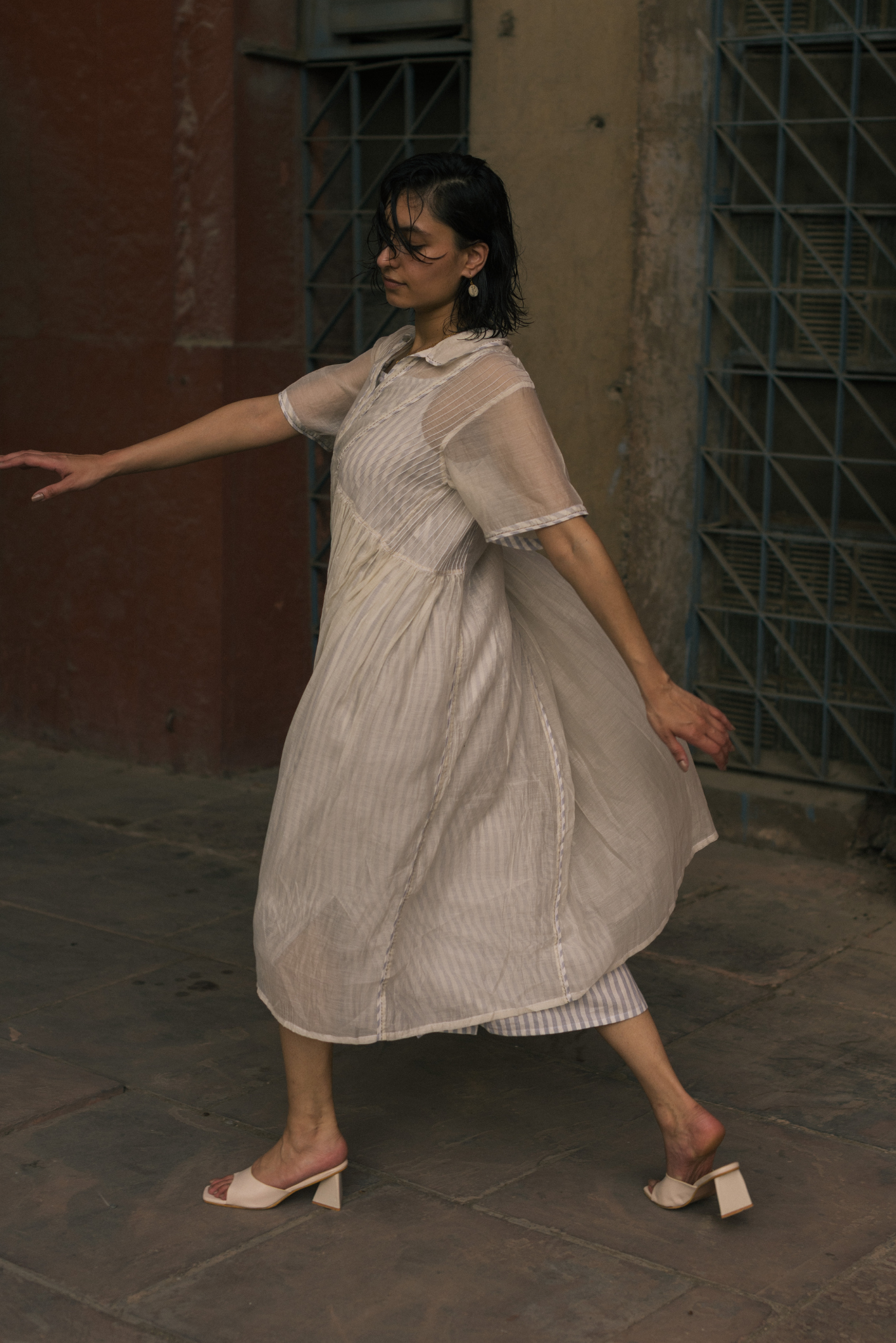 The silhouette features a shirt collar and pintucks along the sides that open into soft gathers from the waist, creating volume with restraint. The construction allows the fabric to move and hold shape with subtle fluidity.