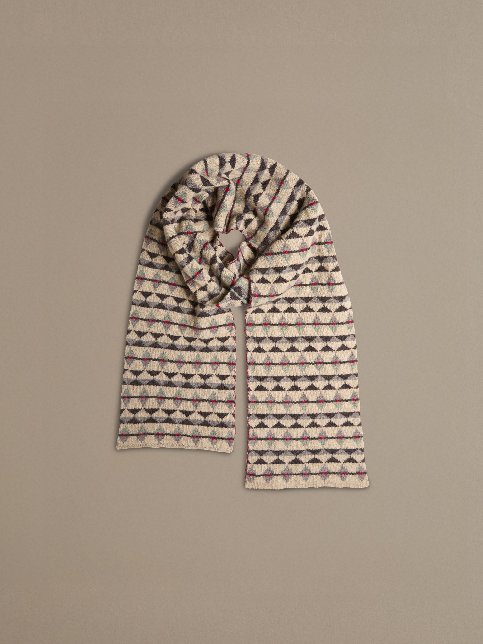 Soft and cossetting, the Fair Folk Scarf is a striking statement piece, knitted in 100% merino lambswool. Its Fair Isle pattern, inspired by the folkloric artworks, brings warmth and character to the everyday.