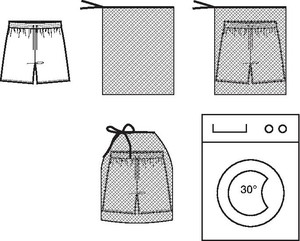 Three-pocket styling. drawstring in black at elasticized waistband. partially lined with fine black mesh made from 100% recycled yarn containing seaqual (recycled plastic sea trash).
