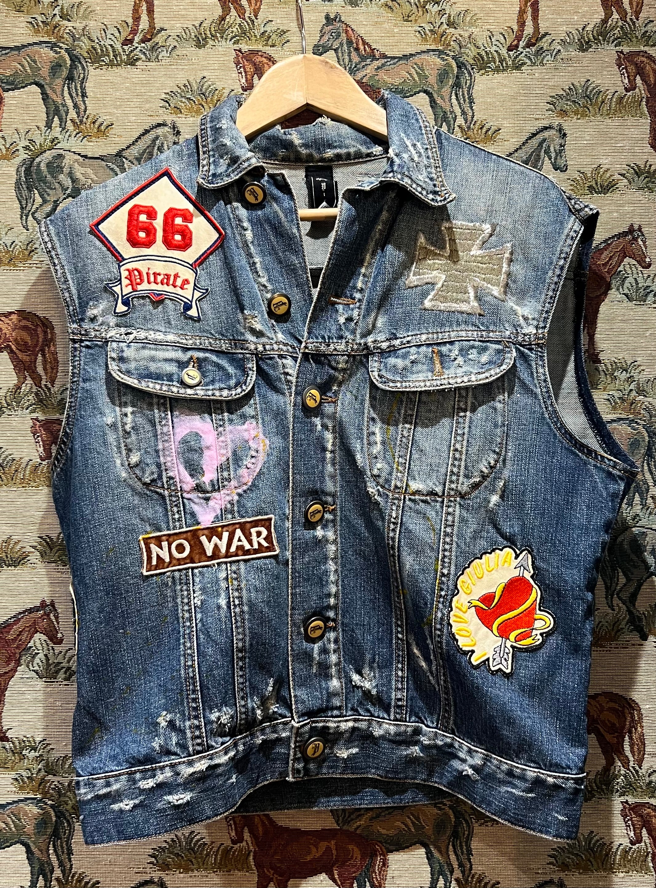 Preloved denim jacket laundered, repaired, decorated by hand with re used textiles and trims. Each piece is unique.