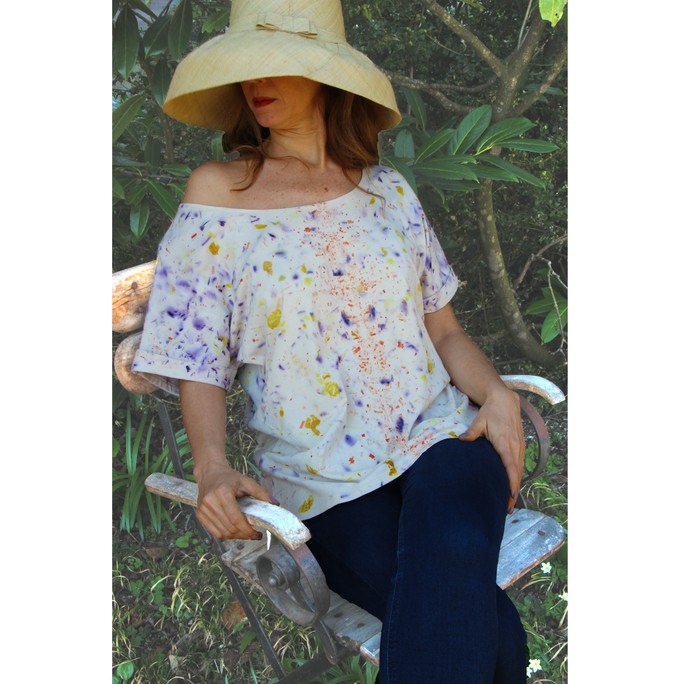 This natural plant print is a completely ecological print, without chemical use and toxic residues. We use only natural flowers, fruits and leaves from selected seasonal plants. Therefore, each piece is unique as each flower and leaf. Consequently, the print pattern varies from garment to garment. Each element is individually manually placed, and the colors do vary, as any variation in weather conditions is affecting the plant pigments.