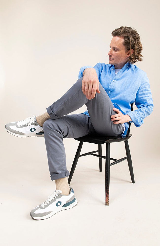 Beautiful gray (storm colored) chino from our French brand Bask in the Sun. The pants have a standard model with 2 slit pockets on the front and 2 pockets on the buttocks. Under the belt loops is a string which makes these pants just a little more original than most chinos.