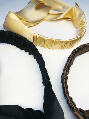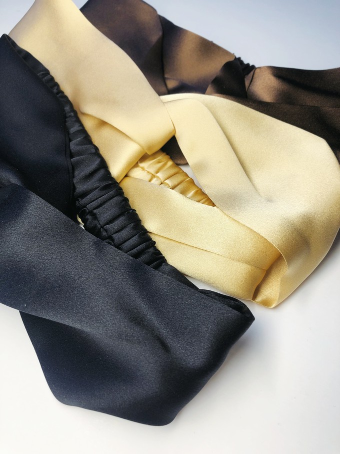 A treat for your hair: a pure silk satin headband. Made from the particularly heavy silk in three colours: midnight black, deep brown or matte gold.